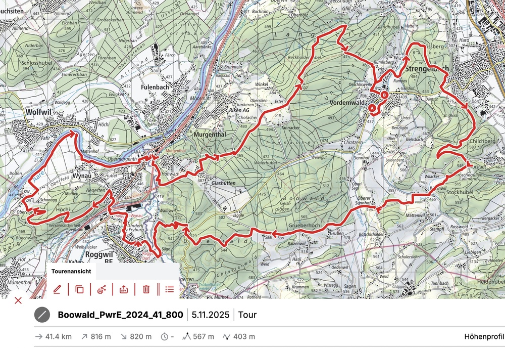 E-Bike Fit: Max Meier; L=: km; Auf/Ab: m Bio-Bike: Fritz Hochuli; L=: km; Auf/Ab: m Die zweitletzte MTB Tour vor dem Jahreswechsel Jahr 2026 führt kreuz und quer durch den Boowald und angrenzende Gemeinden. Die drei Leistungskategorien (Power-eMTB, FIT-eMTB und Bio-MTB (ohne Unterstützung) fahren auf verkehrsarmen Natur- und Waldstrassen und verschlungenen Wegen, legen zwischen 42 und 25 km zurück und bewältigen zwischen 650 bis 820 Höhenmeter. Die Gruppen wählen unterschiedliche Routen, und treffen sich zu einem wärmenden Schlusstrunk in Vordemwald. | |