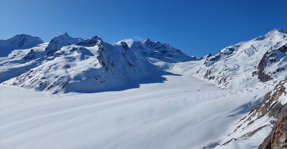 1. Tag Anreise nach Jungraujoch, Aufstieg zum Louwitor oder Lowihorn und Abfahrt zur Hollandiahütte. 2. Tag Mittaghorn oder Äbni Flue, Abfahrt zur Konkordiahütte. 3. Tag Aufstieg zur Grünhornlücke, bei guten Verhältnissen Wysnollen, Abfaht zur Finsteraarhorn Hütte 4. Tag Aufstieg Vorderes Galmihorn, Abfahr durch Bächlital nach Reckingen | |