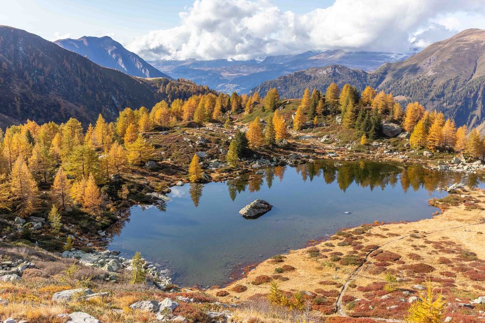 ZusatzinfoIm Mässersee spiegeln sich die umliegenden Gipfel und die leuchtenen Lärchen mit ihren goldenen Herbsfarben, ein Augenschmaus der Sonderklasse.